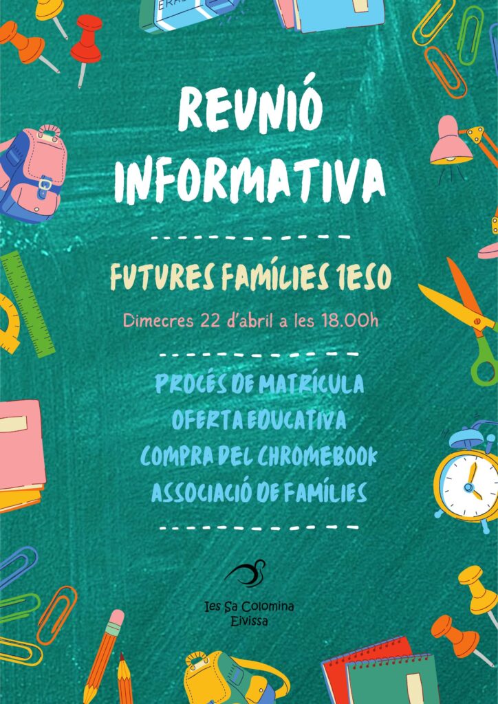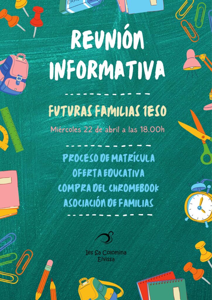 Ens dirigim a vosaltres des de l’IES sa Colomina, per convocar-vos a la reunió informativa el dimecres dia 22 d’abril a les 18.00 h a la biblioteca de l’IES. En aquesta reunió es tractarà el procés de matrícula, el funcionament del nostre IES, la compra del Chromebook, així com informació relacionada amb l’associació de famílies.